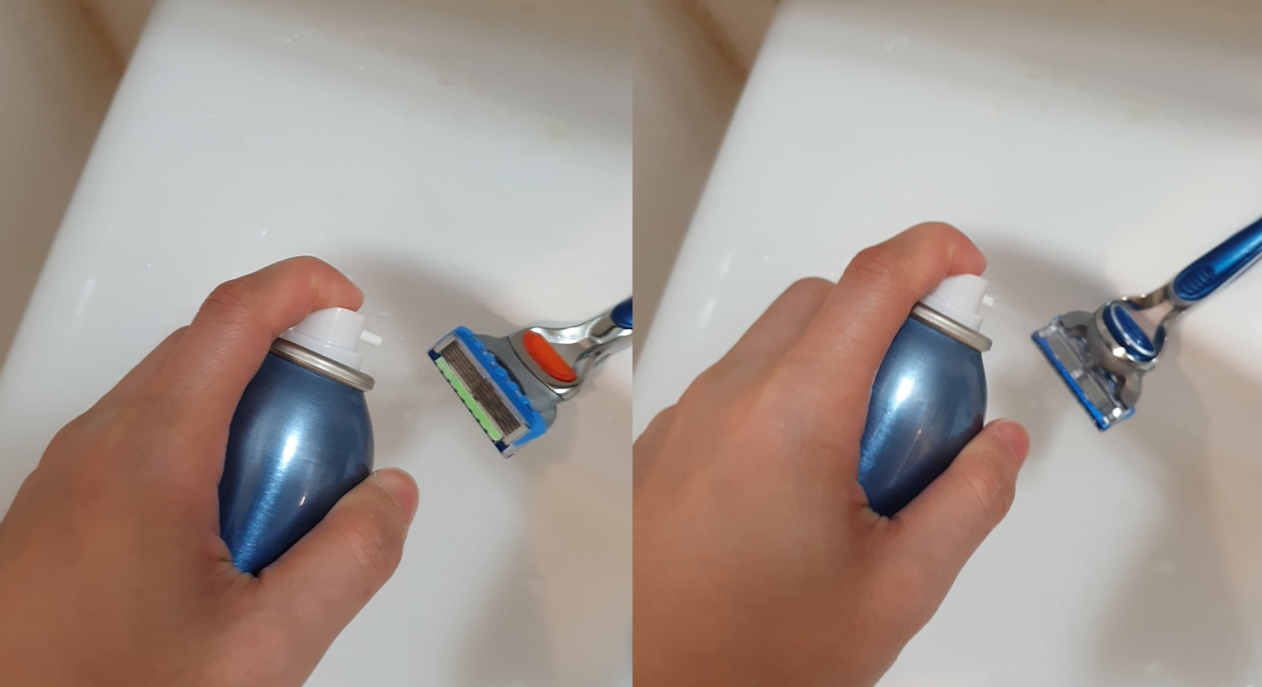 일단 분사력이 너무 강하고 좁게 분사되기 때문에 면도날에 넓게 분사를 하기 위해서는 왔다 갔다 하며 분사해줘야 합니다.