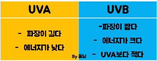 UVC의 경우 대부분이 오존층에 흡수되기 때문에 UVA, UVB에 대해서 알면 됩니다.